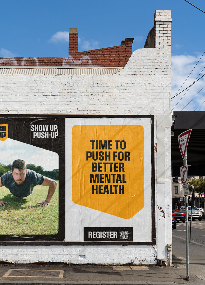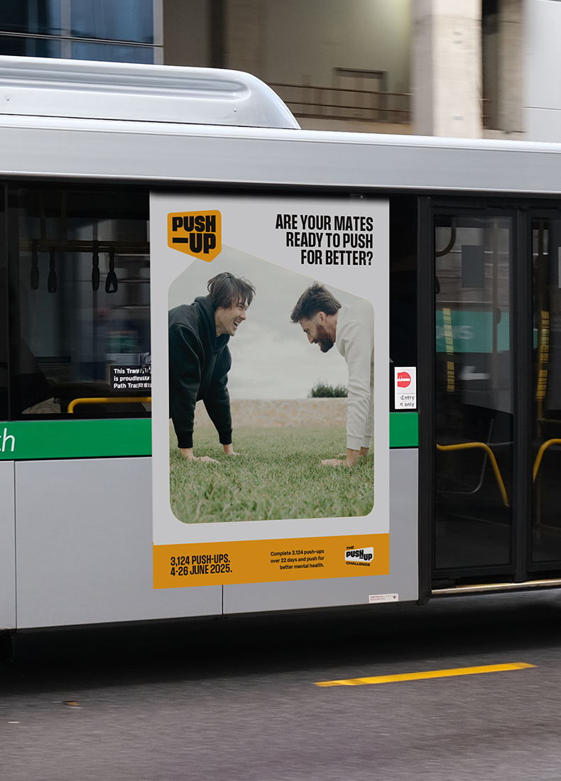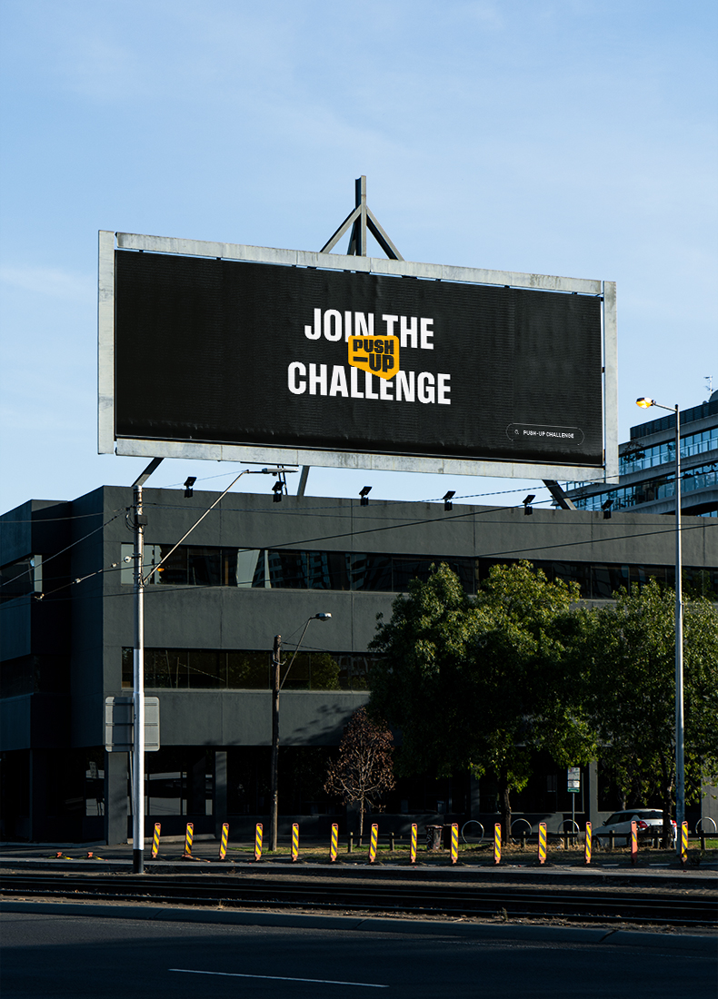 The Push-Up Challenge is Australia’s largest fitness and mental health event. The brand brings both into focus, not as competing messages but as one clear reason to take part. It provides people with something to train for, discuss, post about, and pass on. Mental health becomes visible in a way that feels active, social, and unforced. The brand leads with action and makes space for vulnerability to follow. Designed to be picked up by thousands, it holds its shape in every setting.