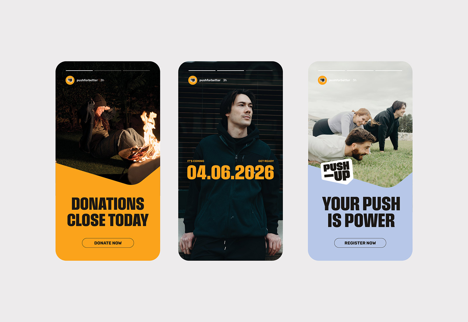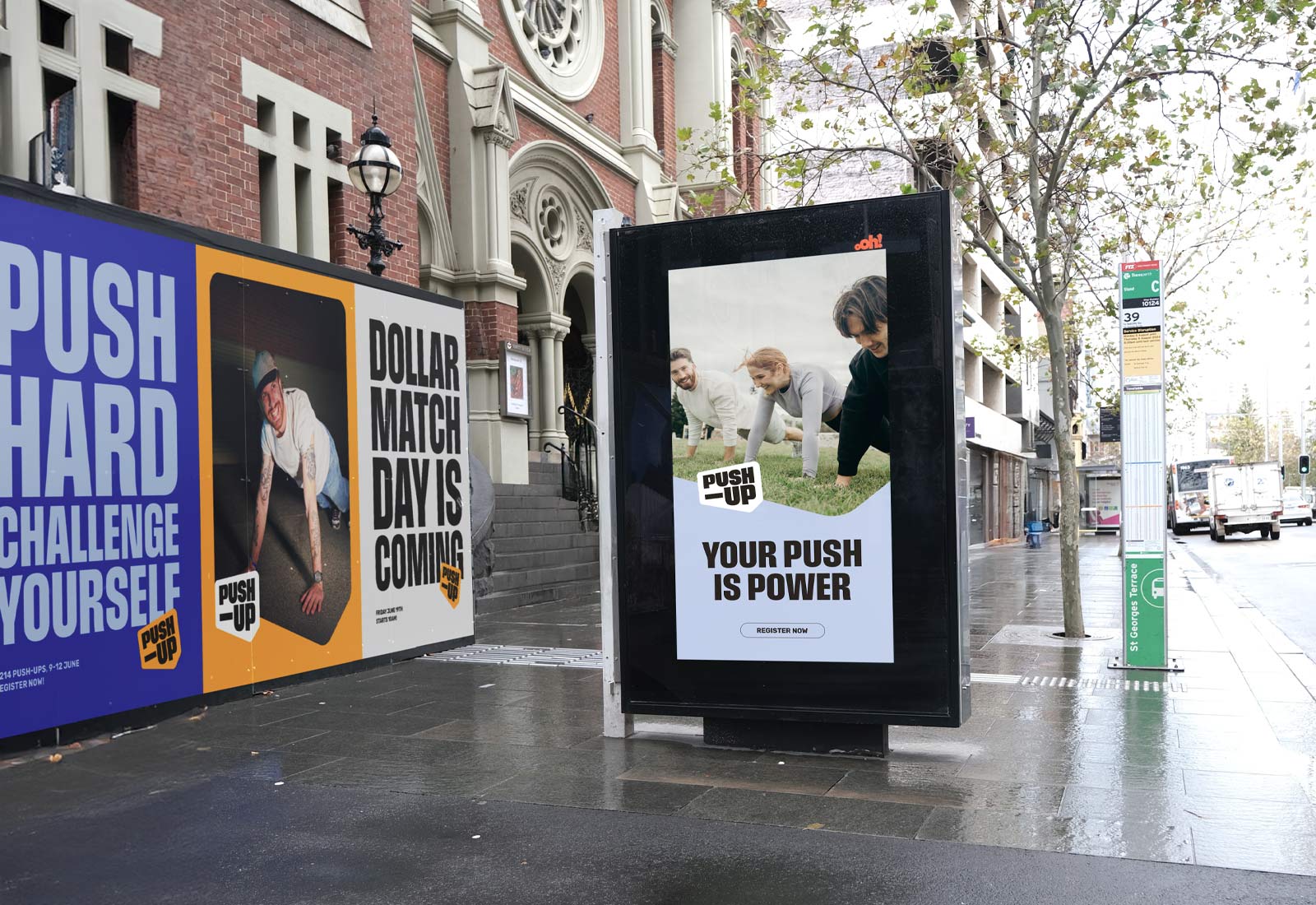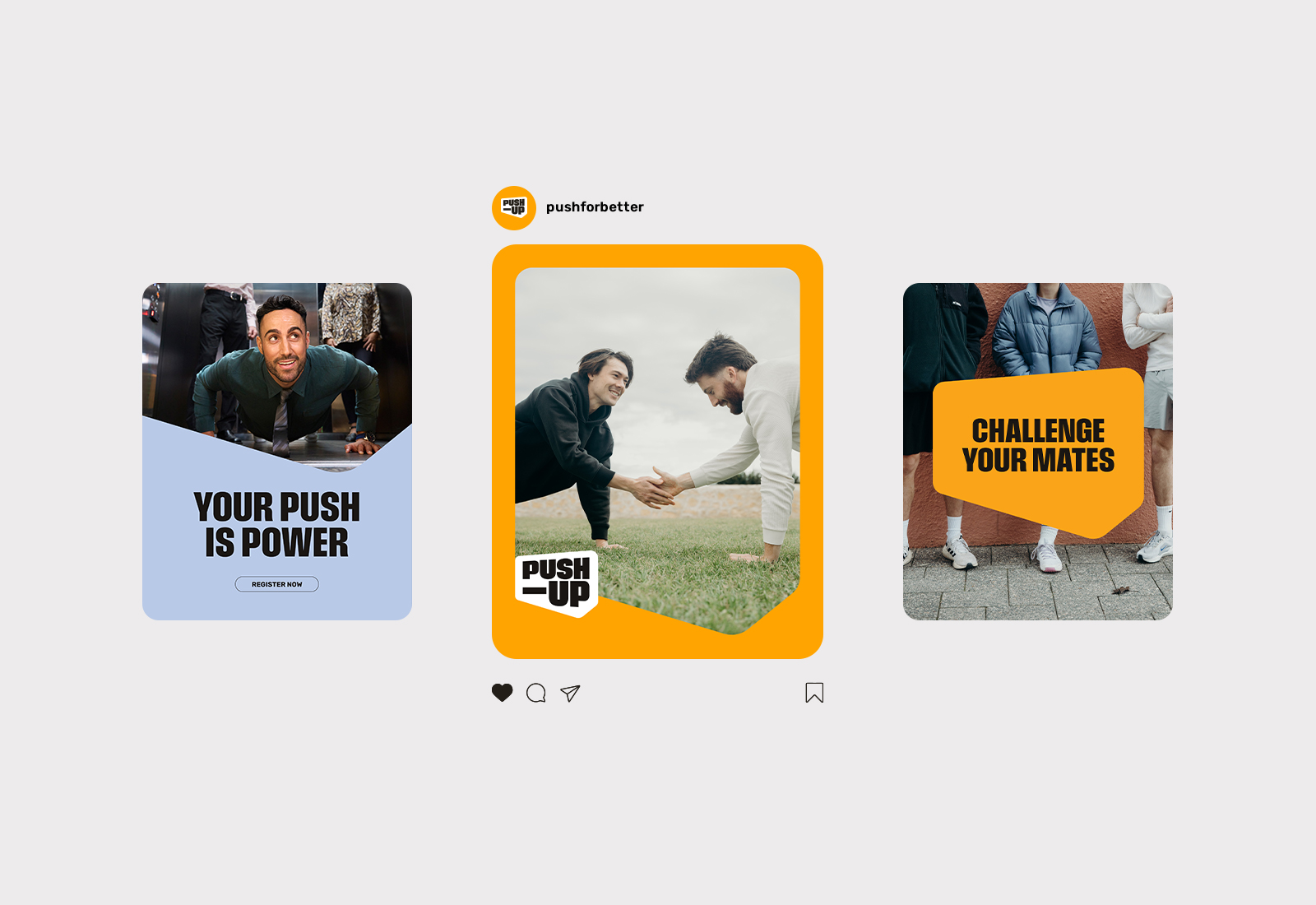 The Push-Up Challenge is Australia’s largest fitness and mental health event. The brand brings both into focus, not as competing messages but as one clear reason to take part. It provides people with something to train for, discuss, post about, and pass on. Mental health becomes visible in a way that feels active, social, and unforced. The brand leads with action and makes space for vulnerability to follow. Designed to be picked up by thousands, it holds its shape in every setting.